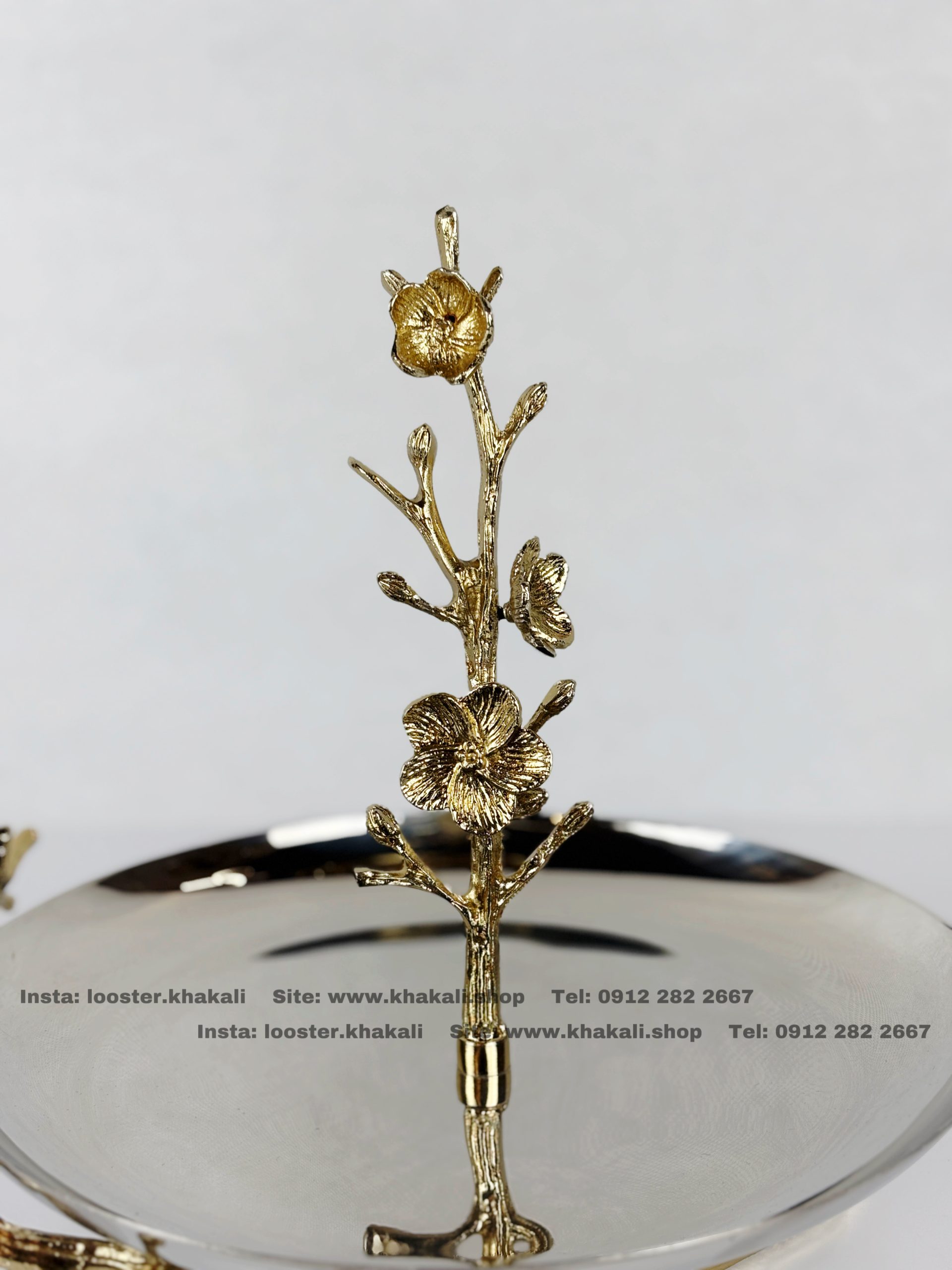 مجموعه ظروف پذیرایی مدل “شکوفه”، یه ترکیب دلنشین از استیل براق و فلز برنجه که با طراحی گلدار و پایههایی شبیه شاخههای طبیعی، حس لطافت و اصالت رو همزمان به فضای پذیراییت میده.