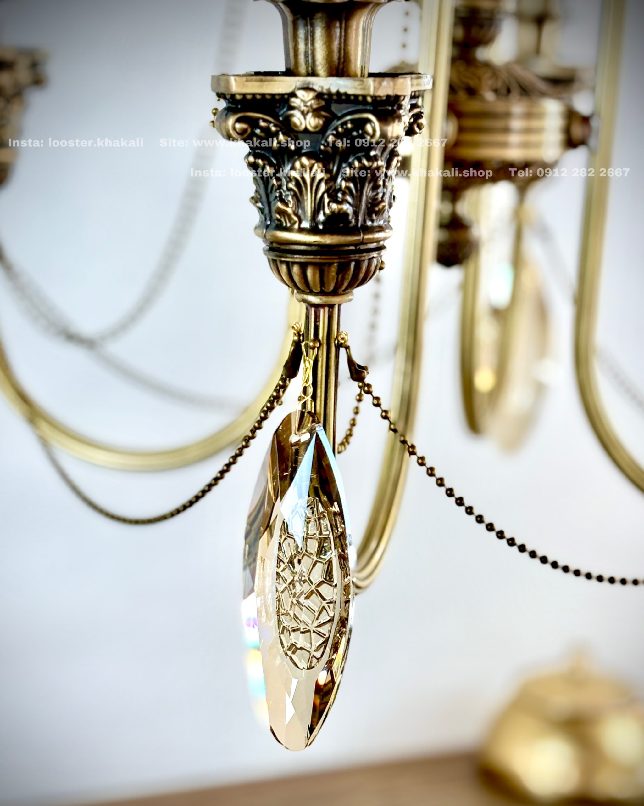 کریستالهای اشکی که در این لوستر استفاده شدهاند، جلوهای خاص و درخشان به آن بخشیدهاند و در کنار زنجیرهای تزئینی و سرپیچهای شمعیشکل، جلوهای چشمنواز و خیرهکننده ایجاد کردهاند که باعث میشود زیر نور، فضای شما درخشان و شیک به نظر برسد.